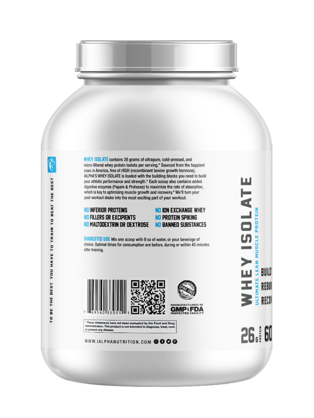 A new generation of whey protein isolate offering premium quality, enhanced functionality, and maximum performance has arrived. Ialpha’s Whey Protein Isolate has been formulated to be everyone’s choice for the pure, clean, and fast digesting whey protein isolate on the market. With no amino spiking, protein blends or concentrates, and no added dyes or colors– bodybuilders and other athletes can support muscle recovery and boost gains in size and strength, without compromise.